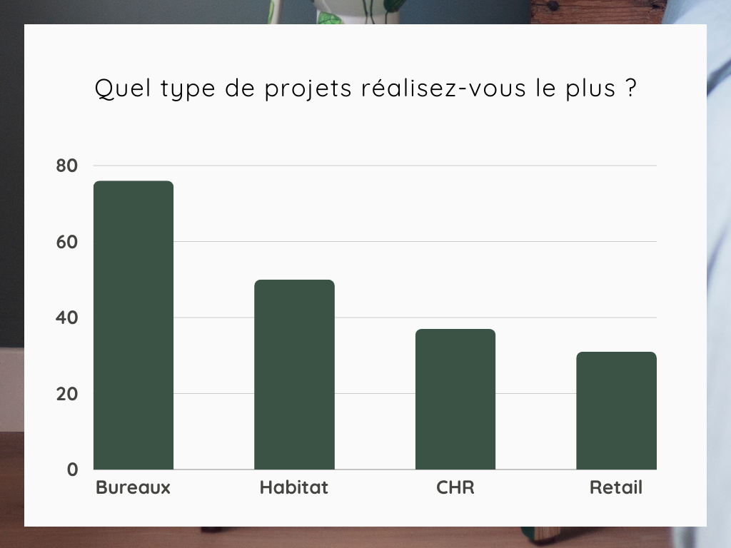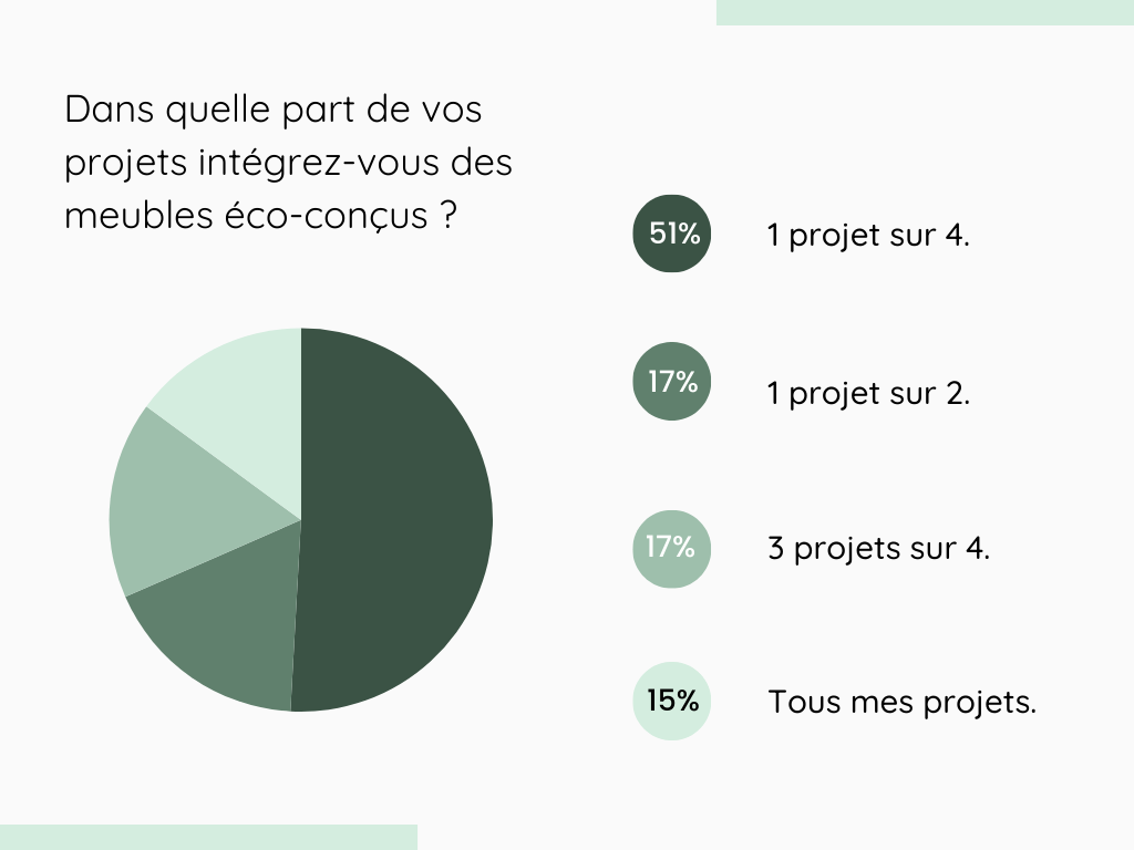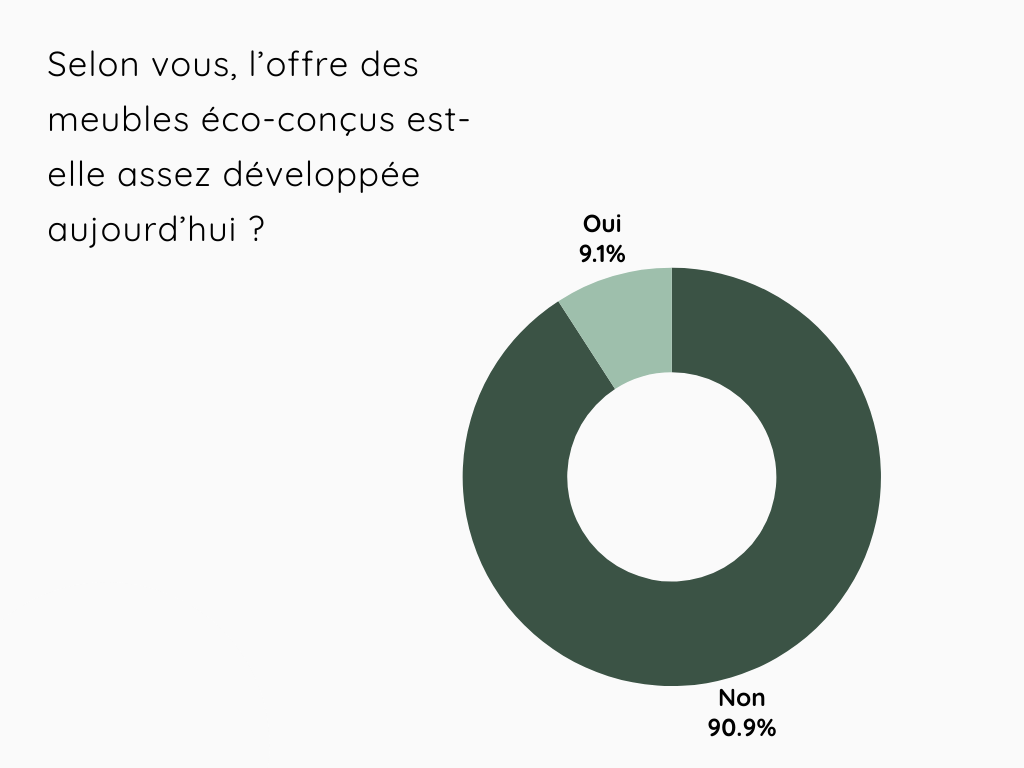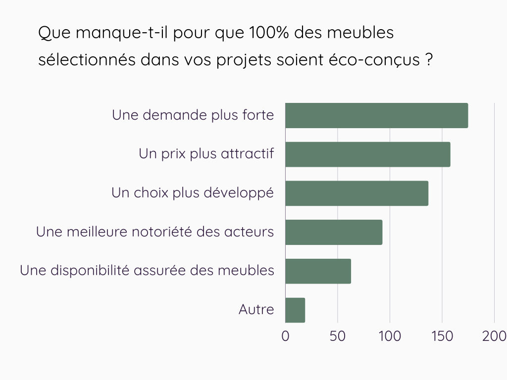 90% des architectes pensent que l’offre de meubles éco-conçus n’est pas assez développée. Leurs 3 besoins prioritaires sont une demande plus forte des clients, un prix plus attractif et un choix plus développé.