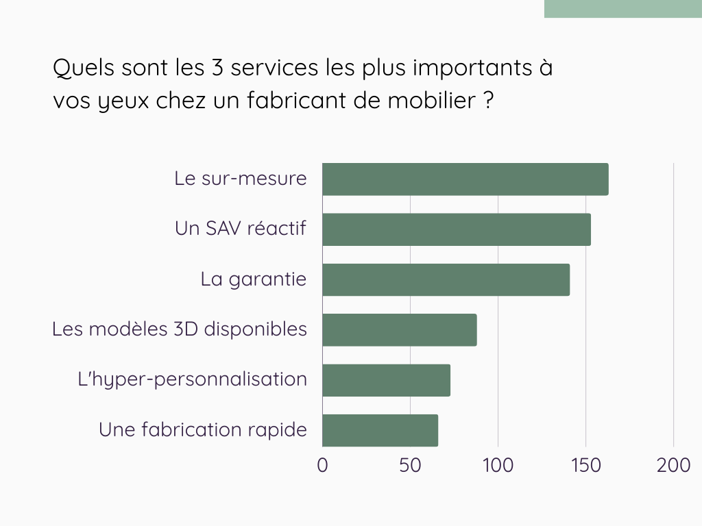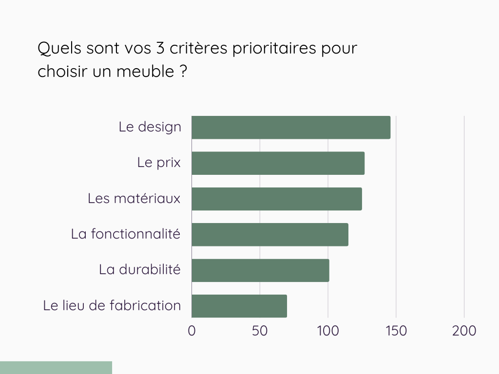 Nous avons demandé : si vous aviez une baguette magique, que changeriez vous dans l'offre des meubles éco-conçus en France ? Voici les 6 besoins, par ordre d’importance :