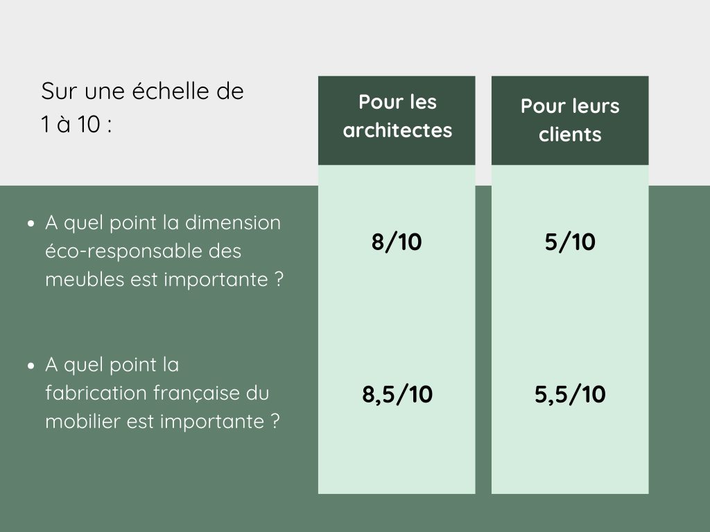 Les architectes d'intérieur et aménageurs notent un fort écart (30%) entre l’importance de l’éco-conception et de la fabrication locale pour eux par rapport à ce qu’ils ressentent auprès de leurs clients.